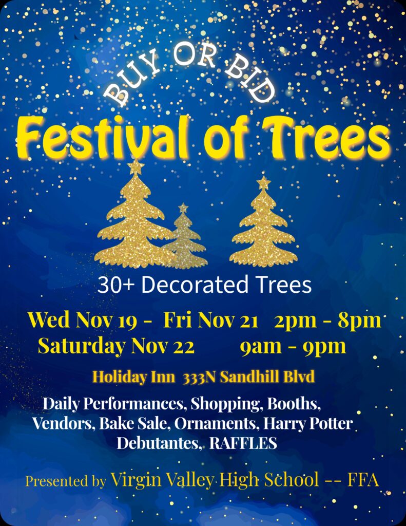 30+ Decorated Christmas Trees. Buy or Bid. Free Entry Daily Performances, Shopping, Booths, Vendors, Bake Sale, Ornaments, RAFFLES Location: Holiday Inn 333N Sandhill Blvd Presented by Virgin Vally High FFA